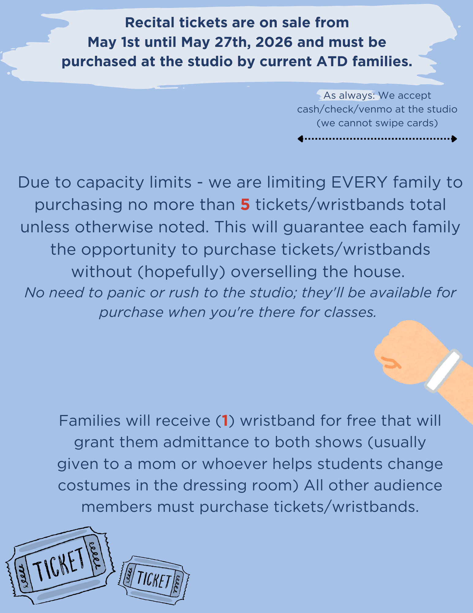 We will have a list available if you need to request more tickets to the recital. Keep in mind we don’t allow dancers to watch the shows unless they sit on laps (so they don’t take a seat away from a ticket holder).