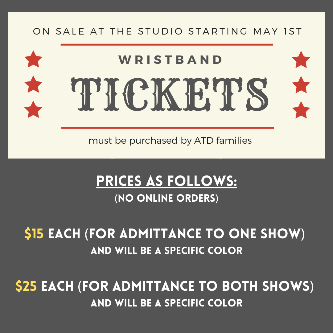 We will have a list available if you need to request more tickets to the recital. Keep in mind we don’t allow dancers to watch the shows unless they sit on laps (so they don’t take a seat away from a ticket holder).